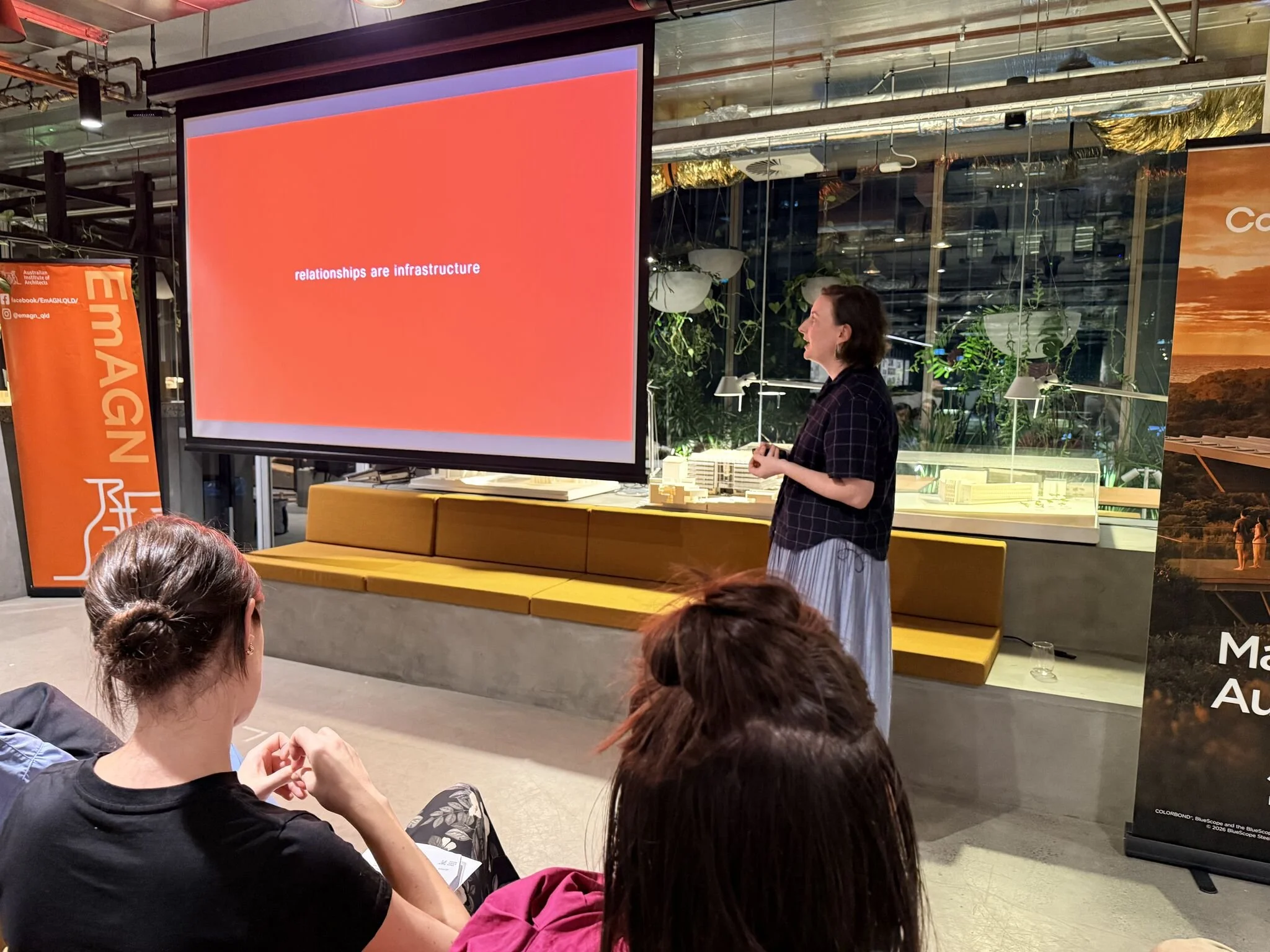 In meanjin, the 2025 Emerging Architect Prize Tour came home — literally! As both the Queensland and national winner, I spoke alone for the first time on the tour to a warm and supportive home crowd and to an online audience via livestream . The talk traced three values and their counterpoints that have been shaping my work and thinking of late: love and limits, beauty and justice, joy and grief. Ideas that are coming up for me are that: relationships are infrastructure, beauty is belonging, and the architect is a translator, not an author. These are working propositions rather than conclusions, and I shared them the same way I have in every city: not to deliver a message, but to see what resonated, what pushed back, and what the profession is sitting with right now. The provocations I left the room with were the ones I keep returning to myself: are we prepared for the moment when the best design decision is to build nothing? Is a building still successful if it is demolished? If belonging produces beauty and not the other way around, what does that mean for the process of creating buildings? How is power showing up in my working relationships, and on whose terms am I working?